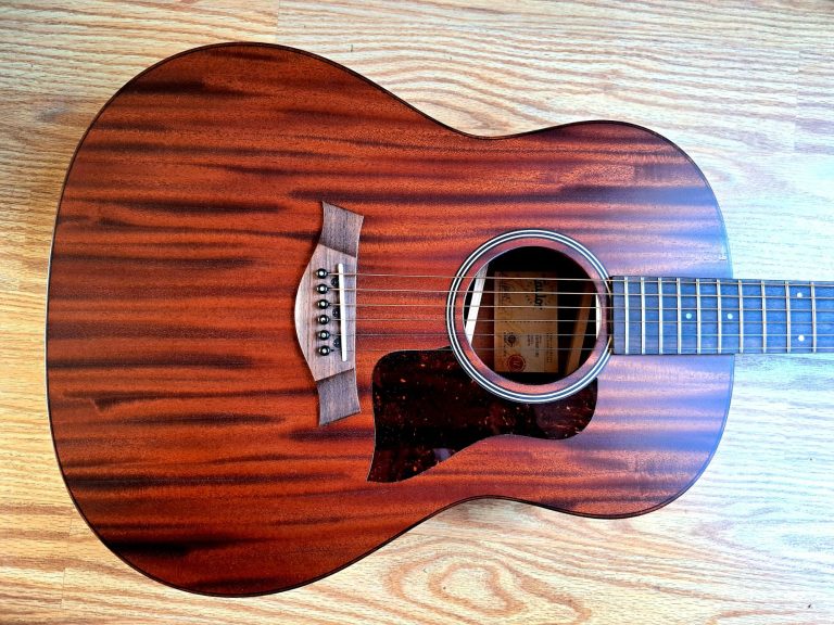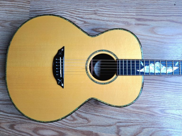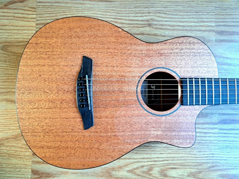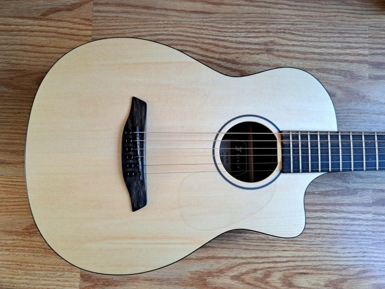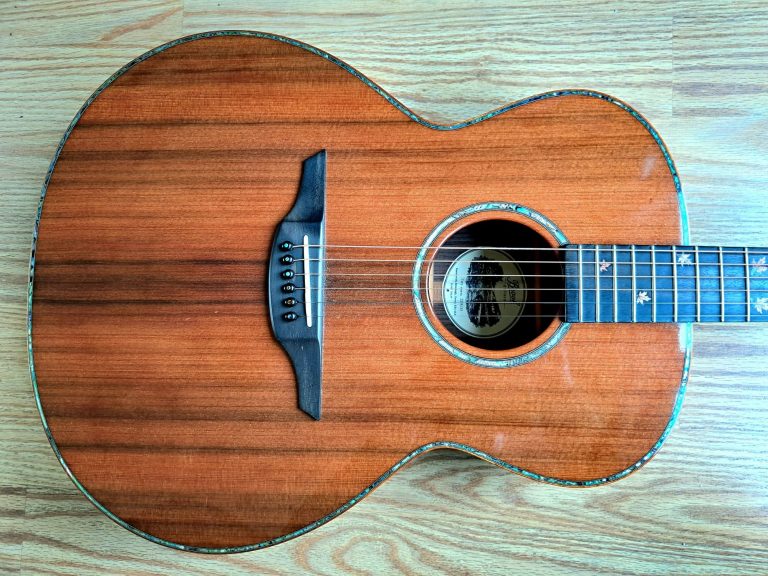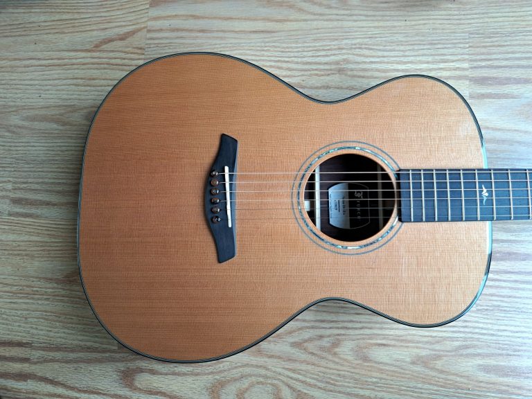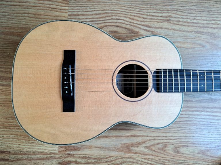 The parlour guitar body shape gives a clear, focused tone, and can actually sound louder than than a larger guitar. They tend to be more midrange focused and can sound quite 'boxy' rather than boomy, due to the tiny waist, although this particular instrument is my Auden Emily Rose Artist, which was designed with a deeper body (from top to back) to give it more internal space, and the resulting tone is much more balanced, with considerably more bass response than one might