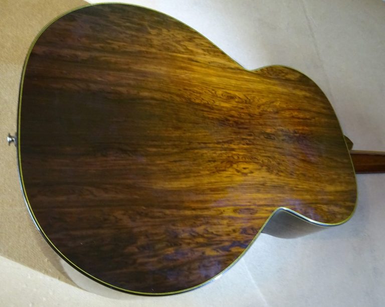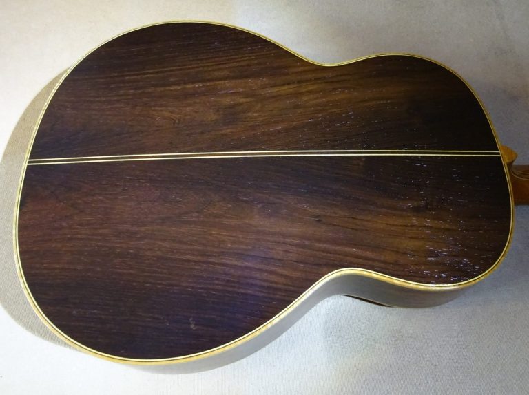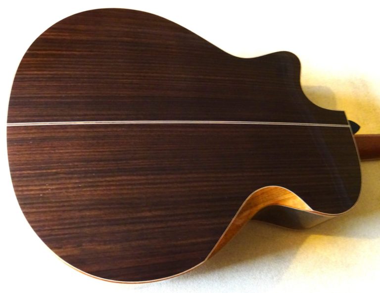 It's a wood that works extremely well with Indian Rosewood back and sides, the depth and clarity of the Rosewood providing a rich sweetness to the tone, which I would describe as 'dark and woody'. As you can see, its visual appeal is enhanced by the contrasting abalone inlays.